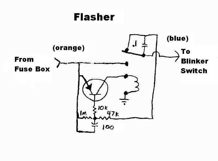Update: 7-14-2005 - The dead link above was to another web page. I have never done the mod but I'll do my best to explain it. Basically you just crack open the flasher and bend an arm to increase the point gap. To get it open you carefully pry back the metal cover where it has been bent over the base plate. Once it is open you can plug it back in and turn on the blinkers. You will see how the thing works. A spring heats up and bends which breaks the circuit, when the spring cools it goes back and completes the circuit again. You should see an arm that you can bend out to increase the gap, the larger the gap the slower it will go. Handle it carefully as parts of it do get hot. You should be able to bend the arm with it working so you can see and hear the change as you are working. Once you have it where you want it then glue the cover back on.