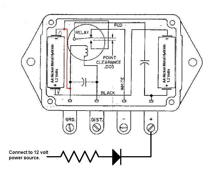 batteries, and a capacitor. The coil of the relay is hooked to the distributor. The points