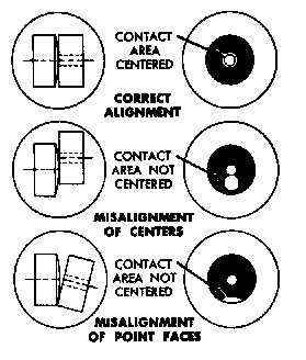 Before we get in depth on the workings of a points system, you first need to know how to set one up. For points to work properly the mechanical assembly has to be in good shape. Lube everything up and check for wear. If anything is sloppy or binding then you won't get a stable dwell. A little slop is not OK. Everything must be like new for the assembly to work properly. If any of your shafts, bushings, or plates show any wear then stop reading now and find replacement parts before continuing. All shafts, bushings, and pivots need to be lubed with light oil. Don’t just squirt it with WD40 or any other “oil” that will quickly evaporate. I use spindle oil but motor oil will work. The breaker cam must be lubed with grease that won’t fly off when it’s spinning. Don’t even think about using motor oil on the cam. You can buy grease specially made for breaker cams but it’s getting harder to find. Camshaft assembly lube works well also. To make the points last longer between adjustments you should polish the breaker cam. The cam surface needs to be smooth. Any rust or gunk built up on the cam will grind away the rubbing block on the points. A fine emery cloth or Scotch Brite pad works well for getting the cam surface back to shiny metal. One thing most people don't consider when installing new points is the contact area. The two contacts should hit dead center, see picture. To align the contacts, bend the stationary breaker point bracket. Do NOT bend the breaker arm. You should also check the breaker arm spring tension, a 2 or 3 pound pocket fishing scale works well for this. Spring tension is usually 16-32 ounces depending on the application. A low rpm motor can get by with 16-20 ounces where a high rpm motor may need as much as 32 ounces to keep the points from bouncing. Higher spring tension increases the rpm range but also wears down the breaker arm rubbing block faster. If you don't rev your motor very high then lower the spring tension and your points will last a lot longer. Next you should set the gap with a feeler gauge to get it running. Turn the motor over until the points rubbing block is on the highest point of the breaker cam. At this point you will have the widest gap between the points. Check the specs for your system to find out what the gap should be. If you don’t know what the spec is, then set them at .015” which is close enough for most systems. You need to develop a feel for adjusting the gap. It’s easy to jam a thick feeler gauge into a narrow gap because the points are spring loaded. You want to adjust it so there is an ever so slight drag. This is even more difficult with a blade type gauge which if turned or tilted even slightly will make it feel like the gap is too small. A wire type gauge makes adjustment easier. The point gap effects the dwell (the amount of time current is running through the coil). The feeler gauge setting is only to get it close enough to run. When the motor is running, you can fine tune it with a dwell meter. The dwell spec is usually given as an angle. What that represents is the degrees the point cam rotates between when the points close and when they open again. A dwell meter will have a different scale for the different engine configurations. The 8 cylinder scale reads 0-45°, the 6 cylinder scale reads 0-60°, and the 4 cylinder scale reads 0-90°. An automotive dwell meter can be used on a motorcycle too if you know what the meter is actually reading. The meter is only measuring duty cycle, the percentage of time that the points are closed. A 27° dwell on an 8 cylinder is a duty cycle of 60% (27/45). If your bike has only one lump on the cam then it fires once every 360°. If the dwell spec is 90° then the duty cycle is 25% (90/360). So using the 6 cylinder scale you would set it to 15° (0.25*60). Once it is all set up, break-in the new points for a couple days, then recheck everything and make any necessary adjustments.