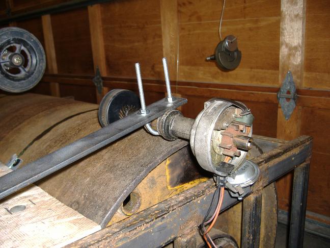 What I did to eliminate the human error was to simply make a dyno pull on the falling weight. The weight and radius of the drum are constant so you should see a flat torque line on a dyno graph. This wouldn’t work with the one-signal-per-revolution sensor on the roller since I will get less than two revolutions before the weight hits the floor. To get more signals per revolution I made an auxiliary rotation sensor by drilling a hole in a hockey puck and shoving it onto the end of a distributor. The hockey puck spins 7-3/4 times per revolution of the roller and the distributor puts out 8 signals per revolution, so I end up with 62 signals per revolution of the roller.